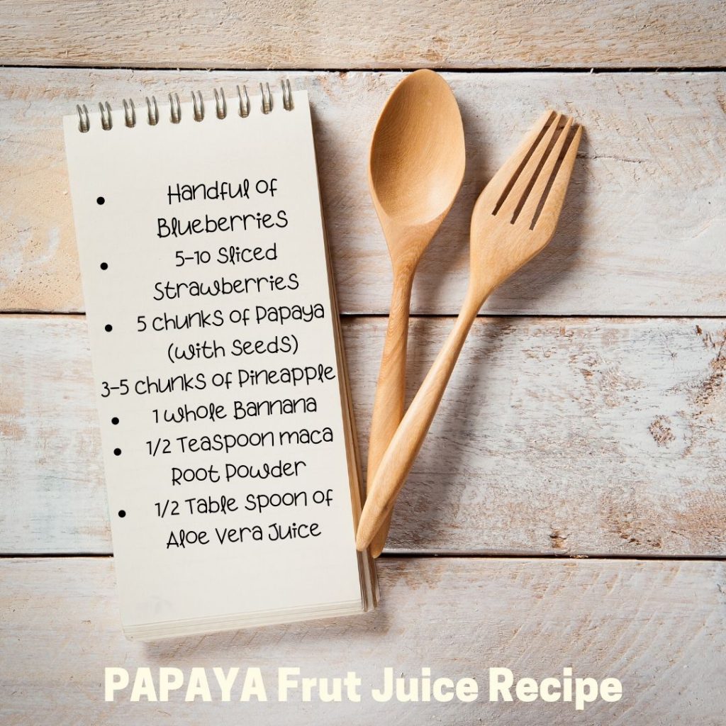 Here’s what I would like for you to try… Get a journal, keep track of what you eat for the next 5 days (start slow). Add this Papaya Fruit Juice Recipe to your morning routine (consume every morning as your breakfast smoothie.) The first day the smoothie may seem a bit strong/powerful but stick with it.  Introduce other plant based foods throughout the day and drink lots of water.  Give it some time and pay attention to how your body/skin starts to feel.